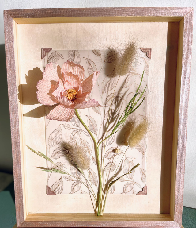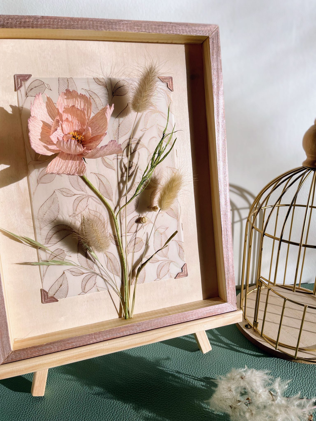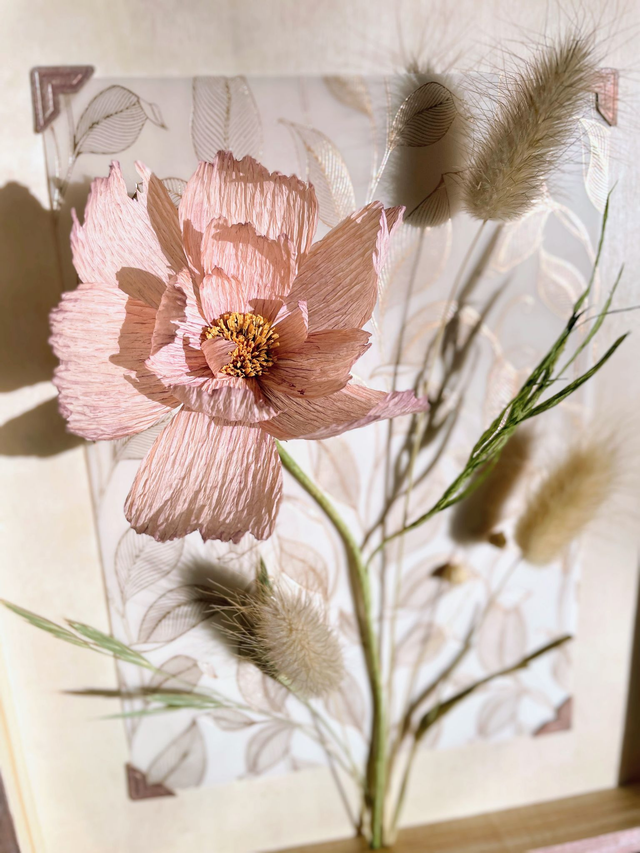 Cadre aérien et épuré mettant en valeur un double Cosmos Oréa façonné à la main. Sur un fond en papier orné de motifs végétaux cuivrés, la fleur se détache en relief accompagnée de quelques fleurs séchées. Les rebords du cadre en bois clair sont délicatement teintés d’un rose cuivré pour apporter douceur et élégance.
