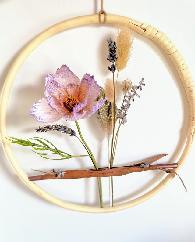 Suspension aérienne mettant en scène le double Cosmos Oréa façonné à la main. Sur un cercle en rotin, la fleur se mêle à plume, fleurs séchées et écorce d’eucalyptus pour une composition légère et poétique.