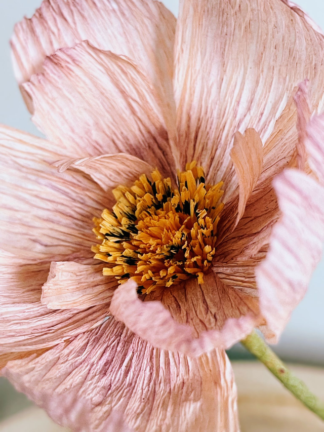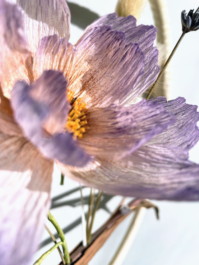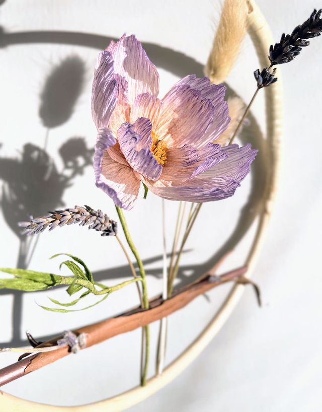 Le Cosmos, modelé à la pastel et légèrement verni, révèle relief et nuances, tandis que sa branche feuillée renforce son réalisme. Idéale pour décorer un mur, une vitrine ou une mise en scène florale, cette suspension apporte une touche bohème et raffinée à tout intérieur.